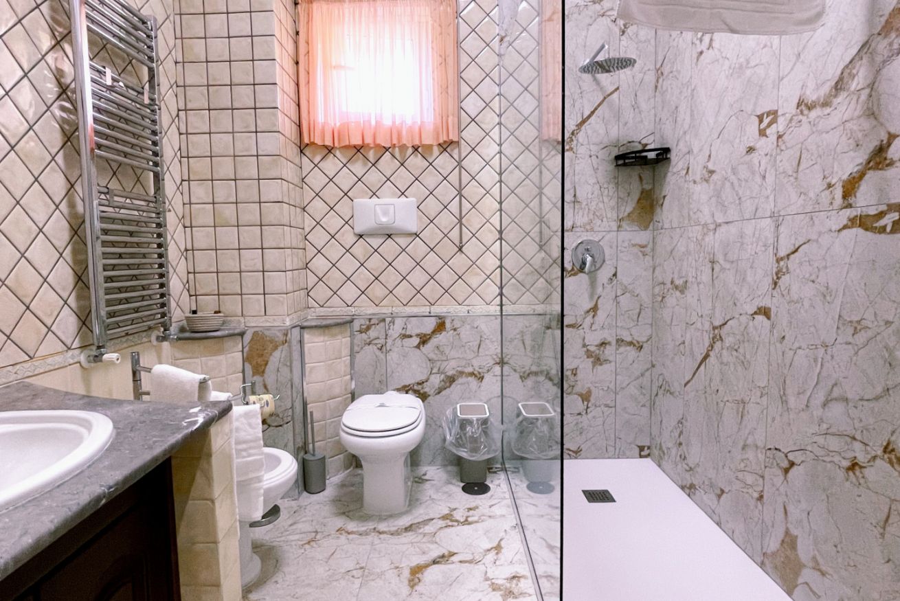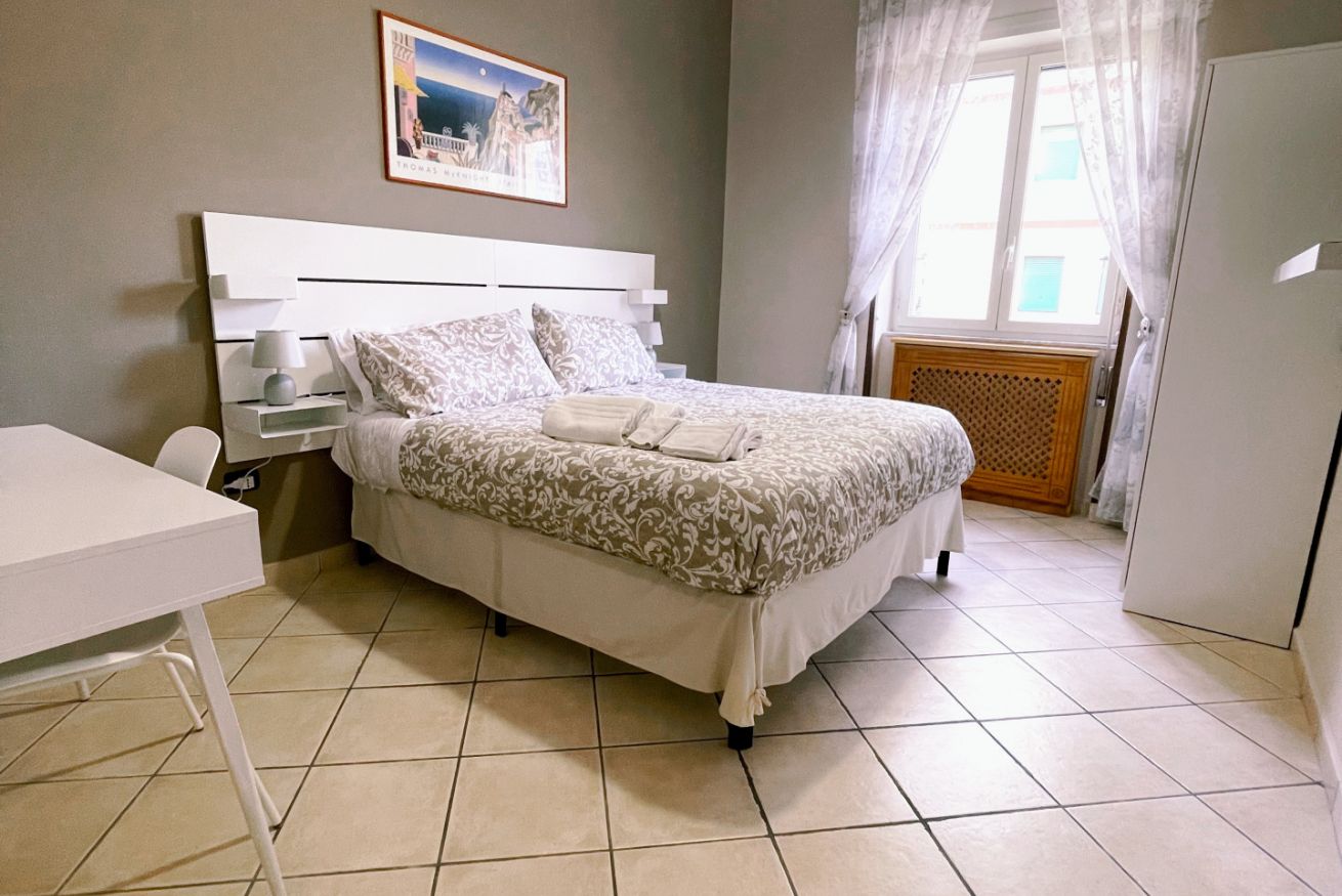 Proseguendo per il corridoio si arriva ad una seconda camera da letto con letto matrimoniale 190x160, scrivania, armadio, Smart tv 43 pollici, aria condizionata freddo/caldo, balconcino con affaccio su ampia strada. Dal corridoio si raggiunge anche il bagno privato con doccia, provvisto di kit di cortesia.