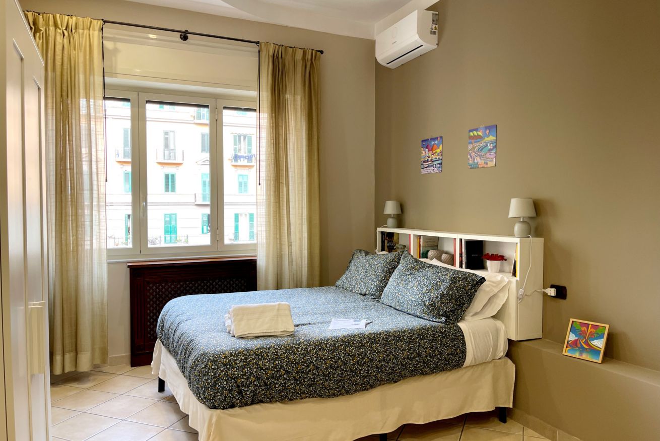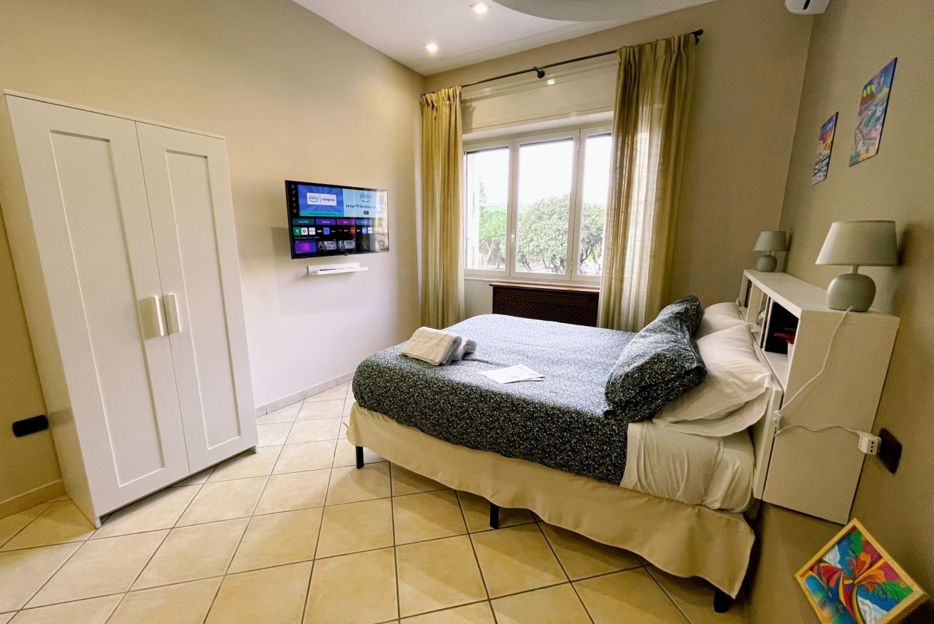 Smart TV da 43 pollici, armadio, aria condizionata freddo/caldo, finestra con affaccio su ampia strada.