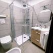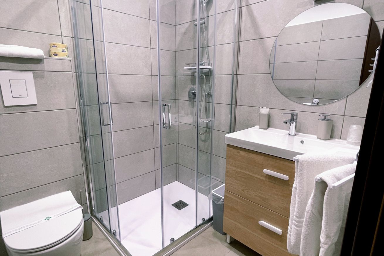 Bagno privato con doccia provvisto di kit di cortesia.